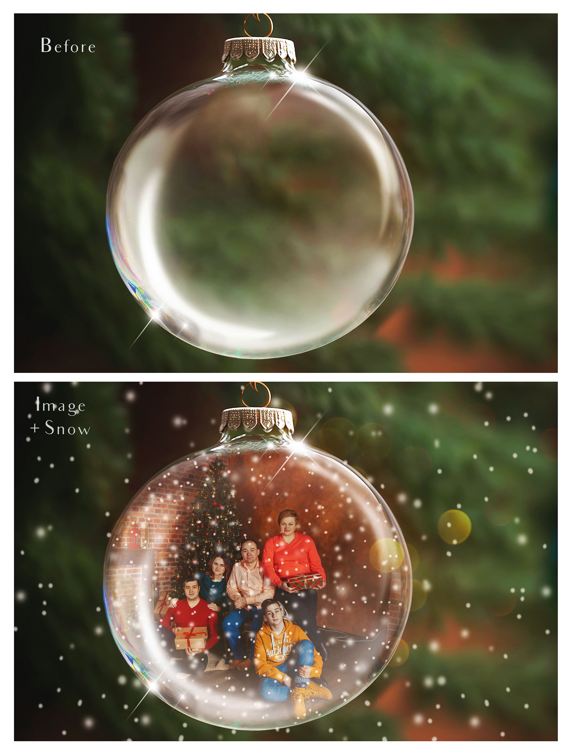 1 PSD File Template which includes all the layers required to add your image to the background. Including colour change layers, Snow flurry Overlays, clipped to the globe, and a clipping mask for you to simply slip in your image.