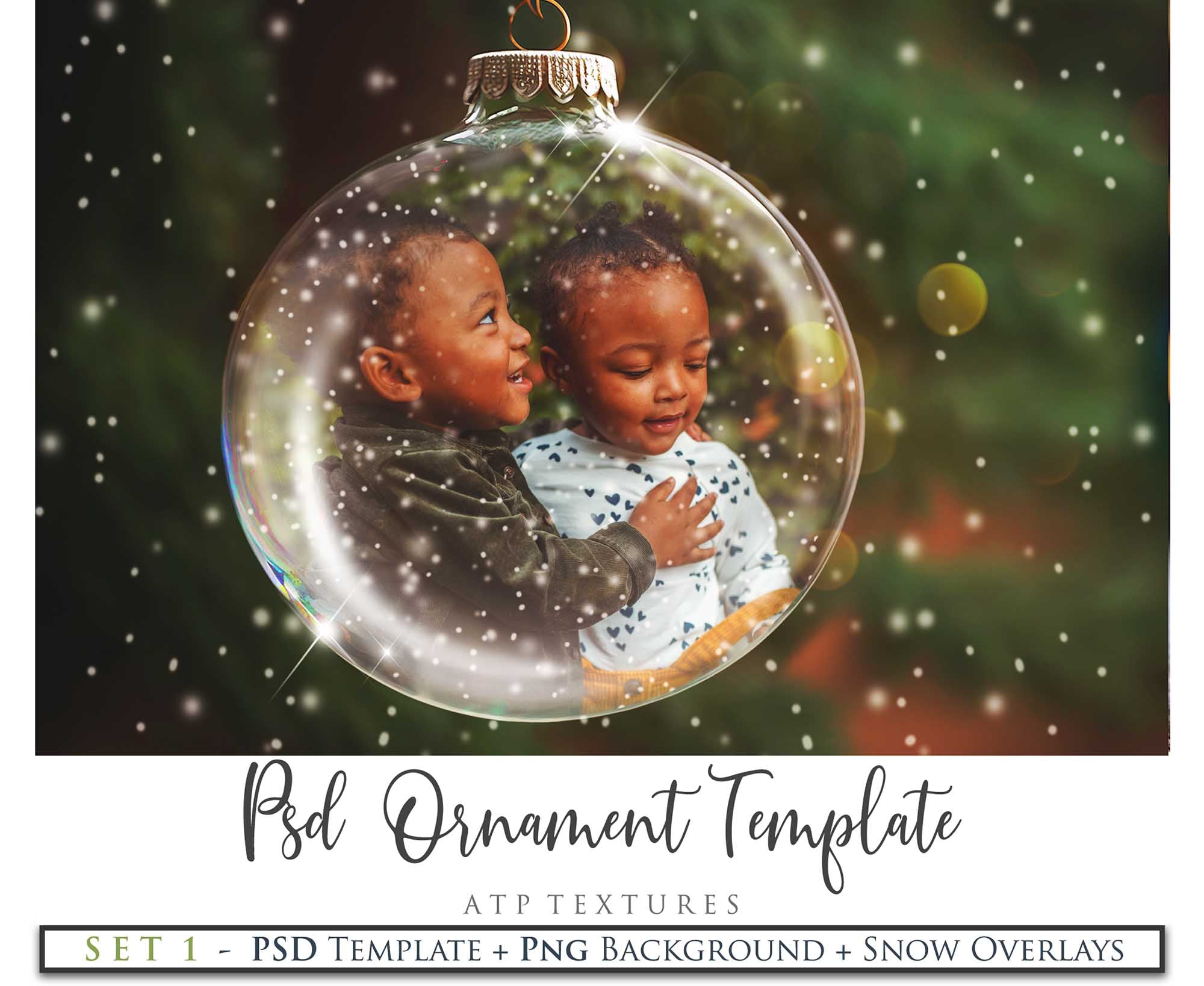 Digital Glass Bauble Background, with snow flurries and a PSD Template included in the set.