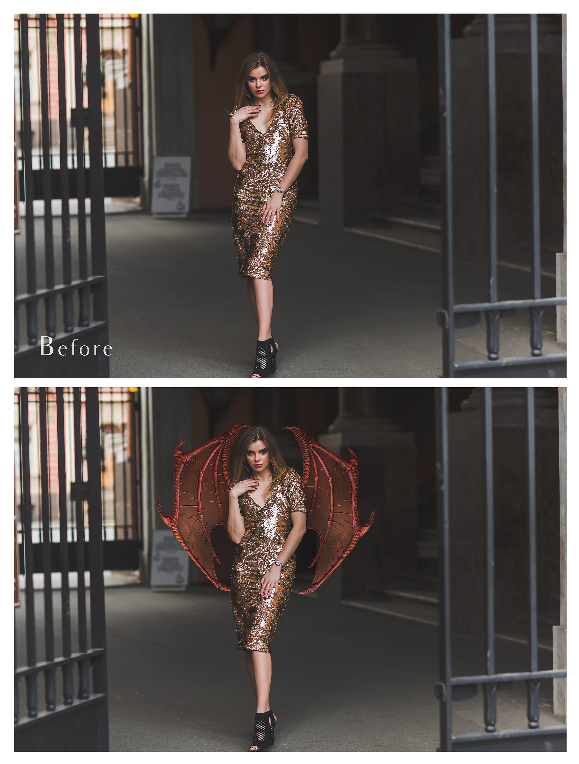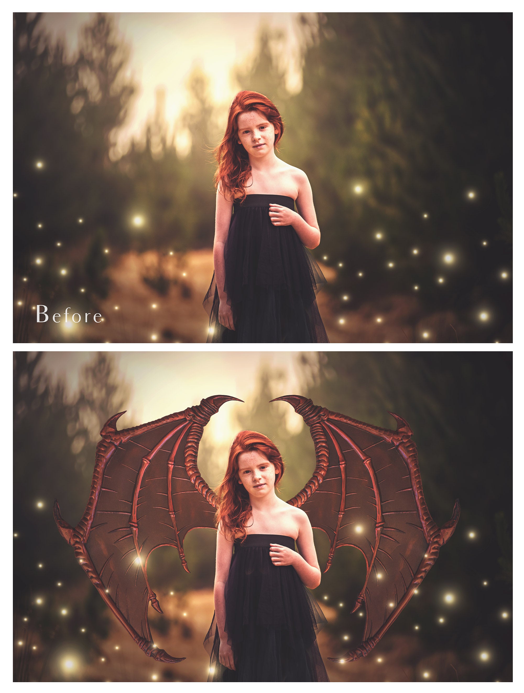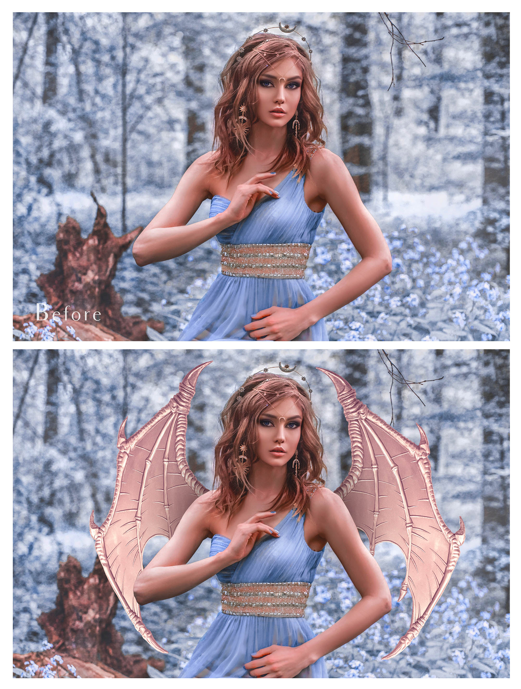 The wings are presented as one side only. This gives you the flexibility to manipulate their overall perspective to suit each one of your images.