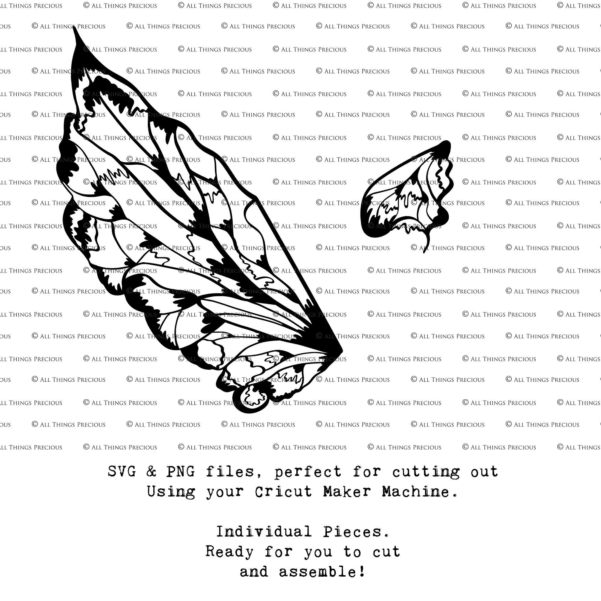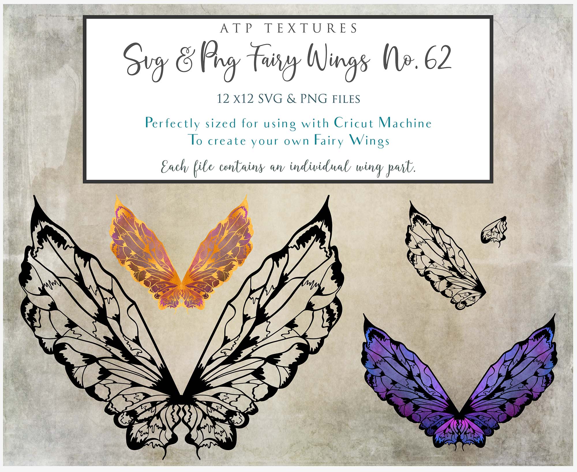 SVG & PNG Fairy/Angel Wing files for Cricut, Silhouette Cameo and other Cutting Machines. Create wearable fairy wings, all sizes. Perfect for Halloween Costumes, Fantasy, Cosplay, Photography. Prints, Wedding, Engagement, Baby Shower invitations, Sublimation Printing, Clip Art and more. Cut and assemble. ATP Textures.