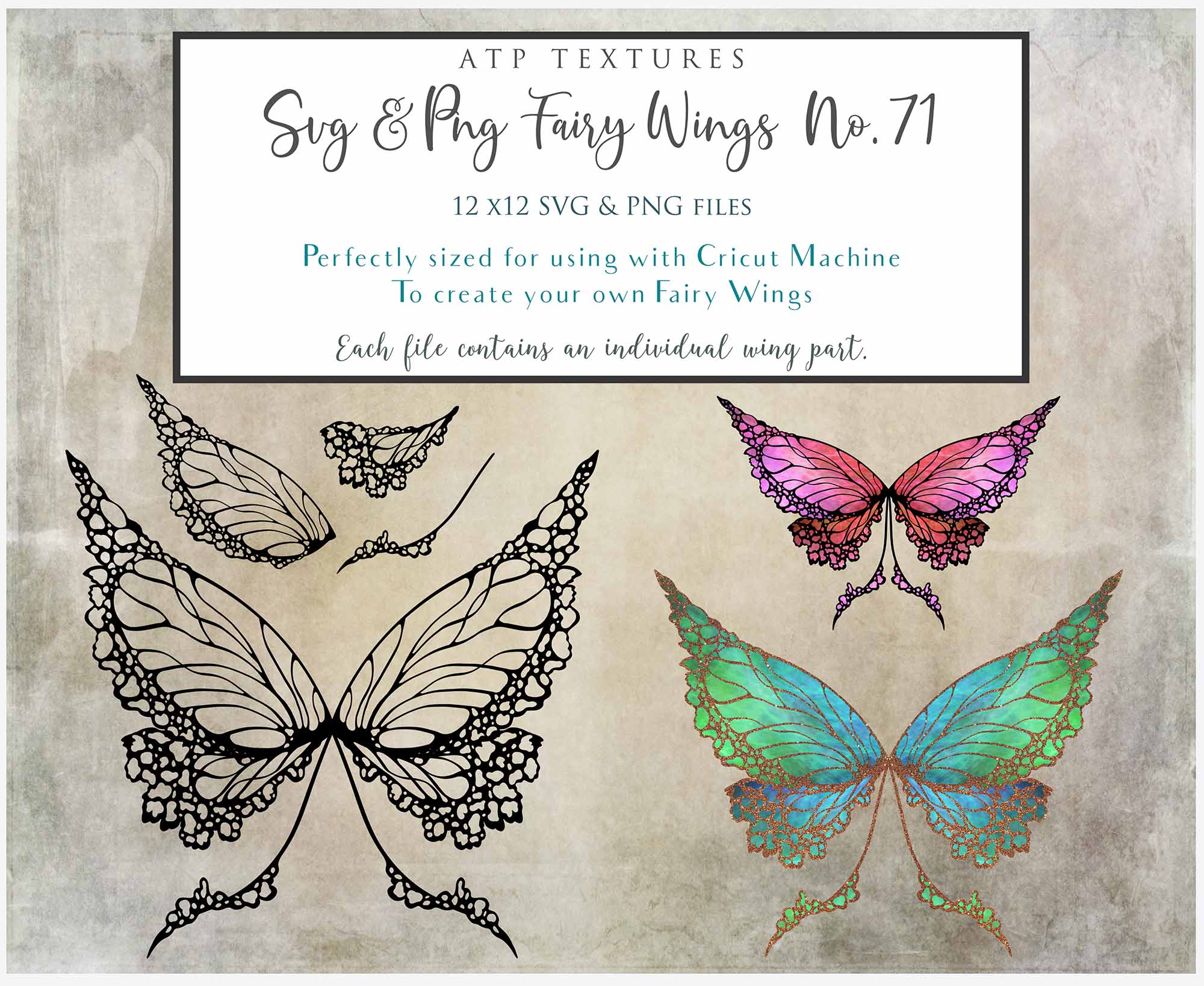 SVG & PNG Fairy/Angel Wing files for Cricut, Silhouette Cameo and other Cutting Machines. Create wearable fairy wings, all sizes. Perfect for Halloween Costumes, Fantasy, Cosplay, Photography. Prints, Wedding, Engagement, Baby Shower invitations, Sublimation Printing, Clip Art and more. Cut and assemble. ATP Textures.