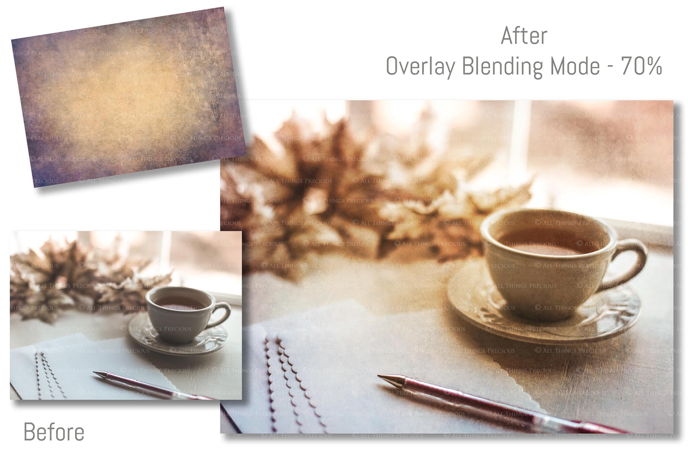 + You can incorporate the textures for sale in your photography as a textured overlay, in a flattened state, without a commercial licence. You will need to add a link to ATP Textures with your listing when selling your work on the internet, eg. Etsy. If you are a professional Photographer supplying a finished, printed photograph to clients, you DO NOT have to credit ATP Textures.