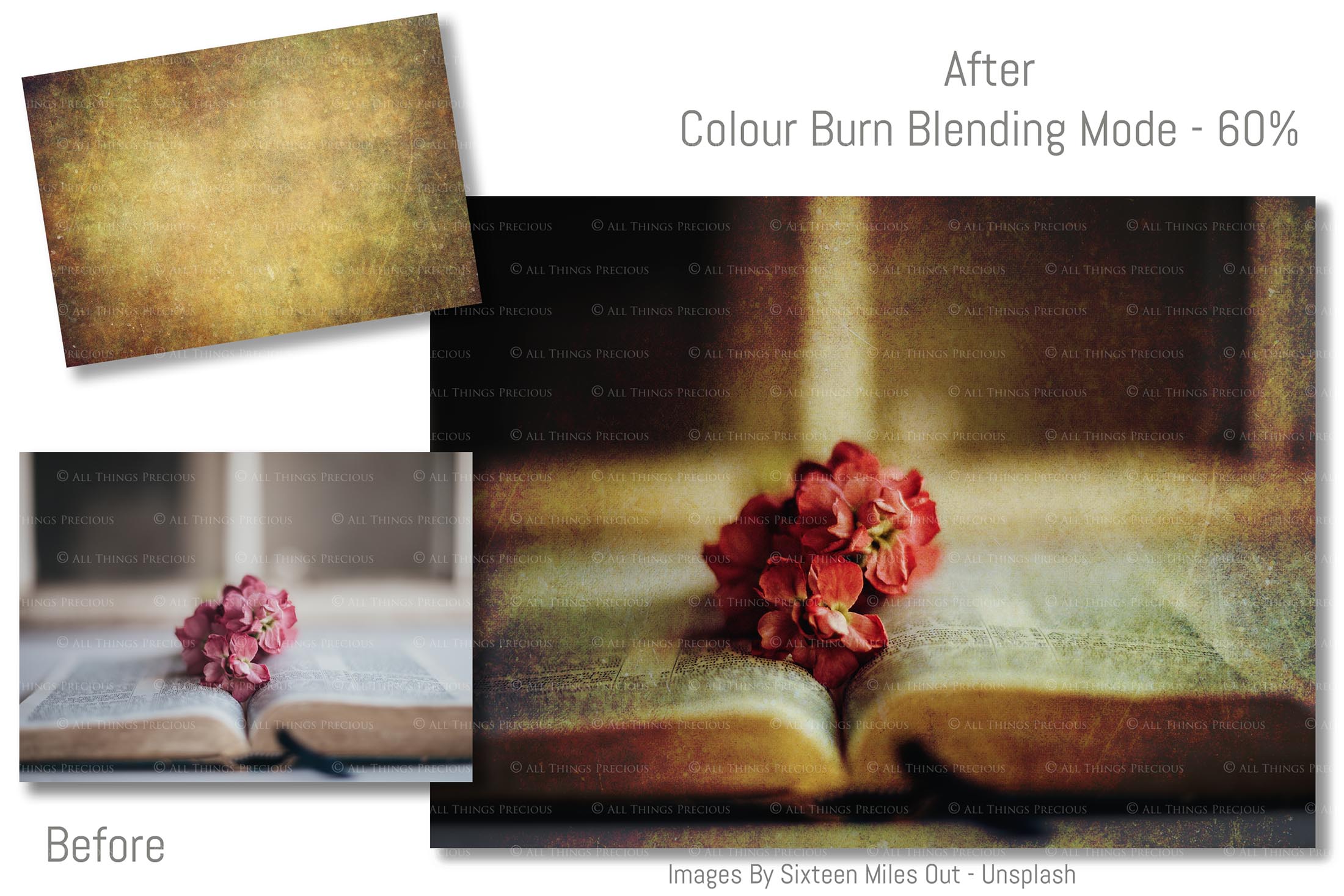 + You can incorporate the textures for sale in your photography as a textured overlay, in a flattened state, without a commercial licence. You will need to add a link to ATP Textures with your listing when selling your work on the internet, eg. Etsy. If you are a professional Photographer supplying a finished, printed photograph to clients, you DO NOT have to credit ATP Textures.