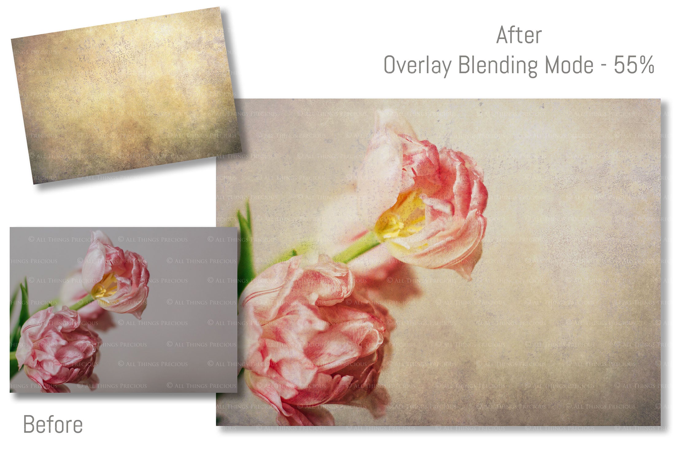 + You can incorporate the textures for sale in your photography as a textured overlay, in a flattened state, without a commercial licence. You will need to add a link to ATP Textures with your listing when selling your work on the internet, eg. Etsy. If you are a professional photographer supplying a finished, printed photograph to clients, you DO NOT have to credit ATP Textures.