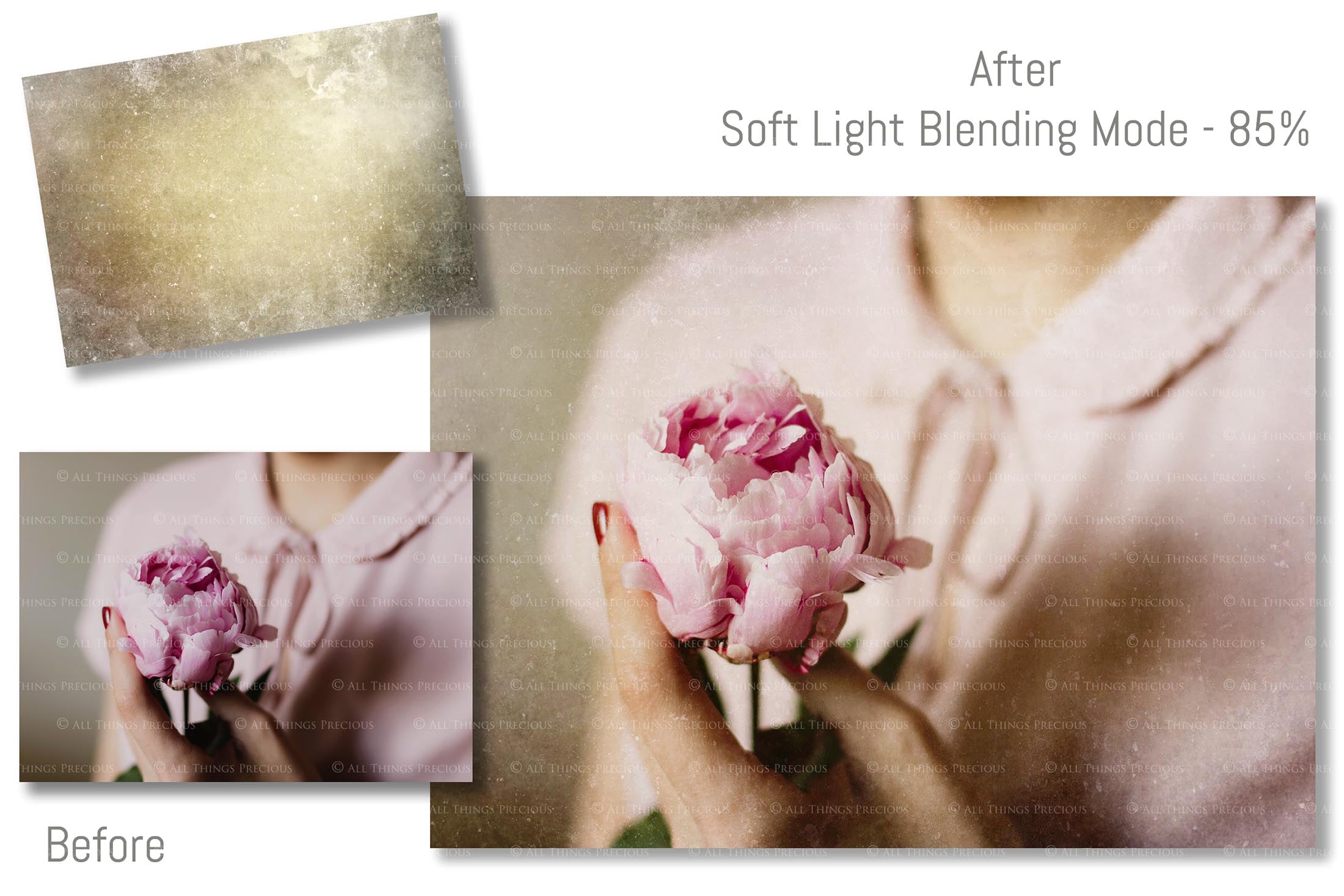 These textures are licensed for one business/photographer/studio only and must not be copied, shared, re packaged for sale or transmitted in any other form, physical or digital, without prior consent from all things precious photography.