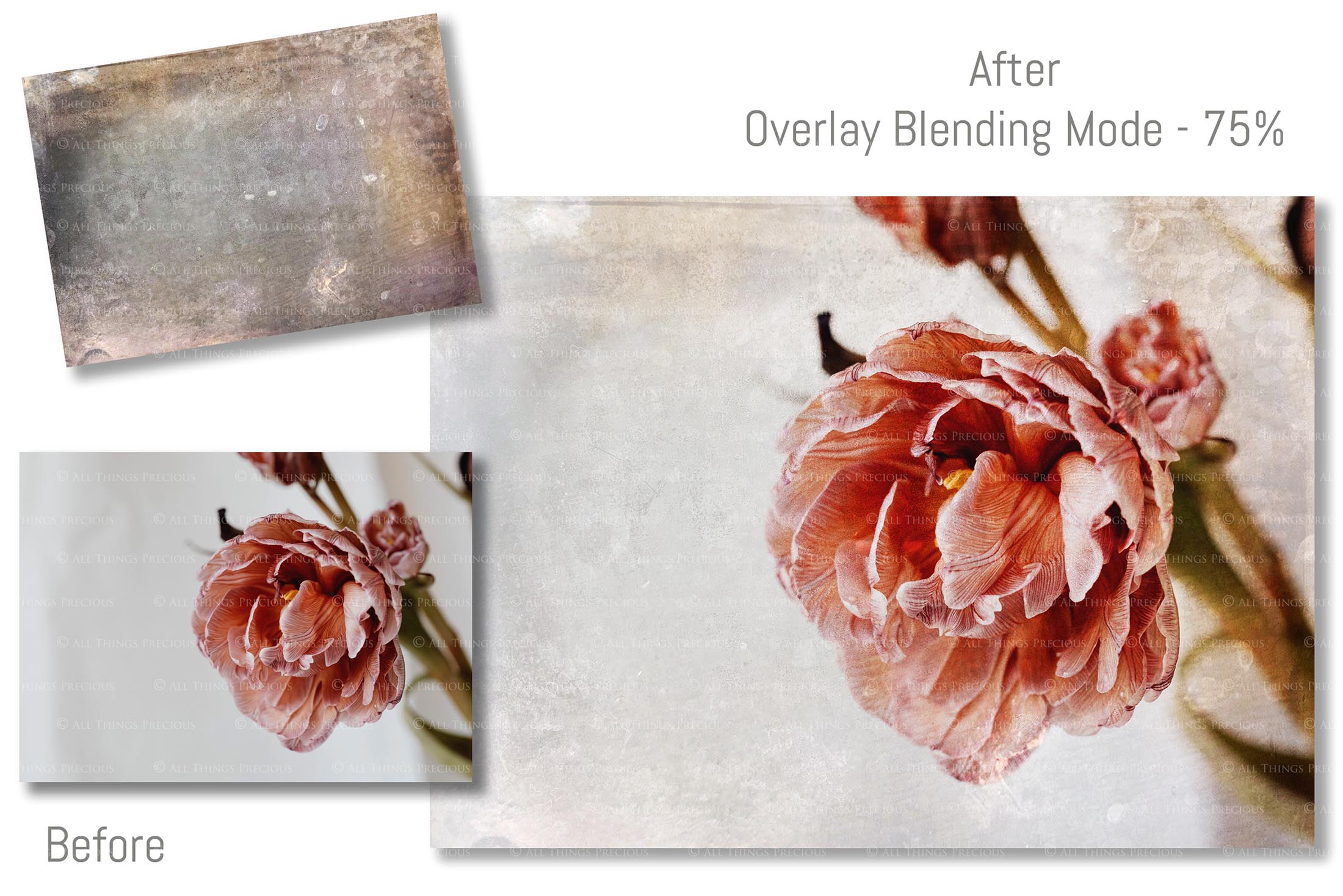 + You can incorporate the textures for sale in your photography as a textured overlay, in a flattened state, without a commercial licence. You will need to add a link to ATP Textures with your listing when selling your work on the internet, eg. Etsy. If you are a professional photographer supplying a finished, printed photograph to clients, you DO NOT have to credit ATP Textures.