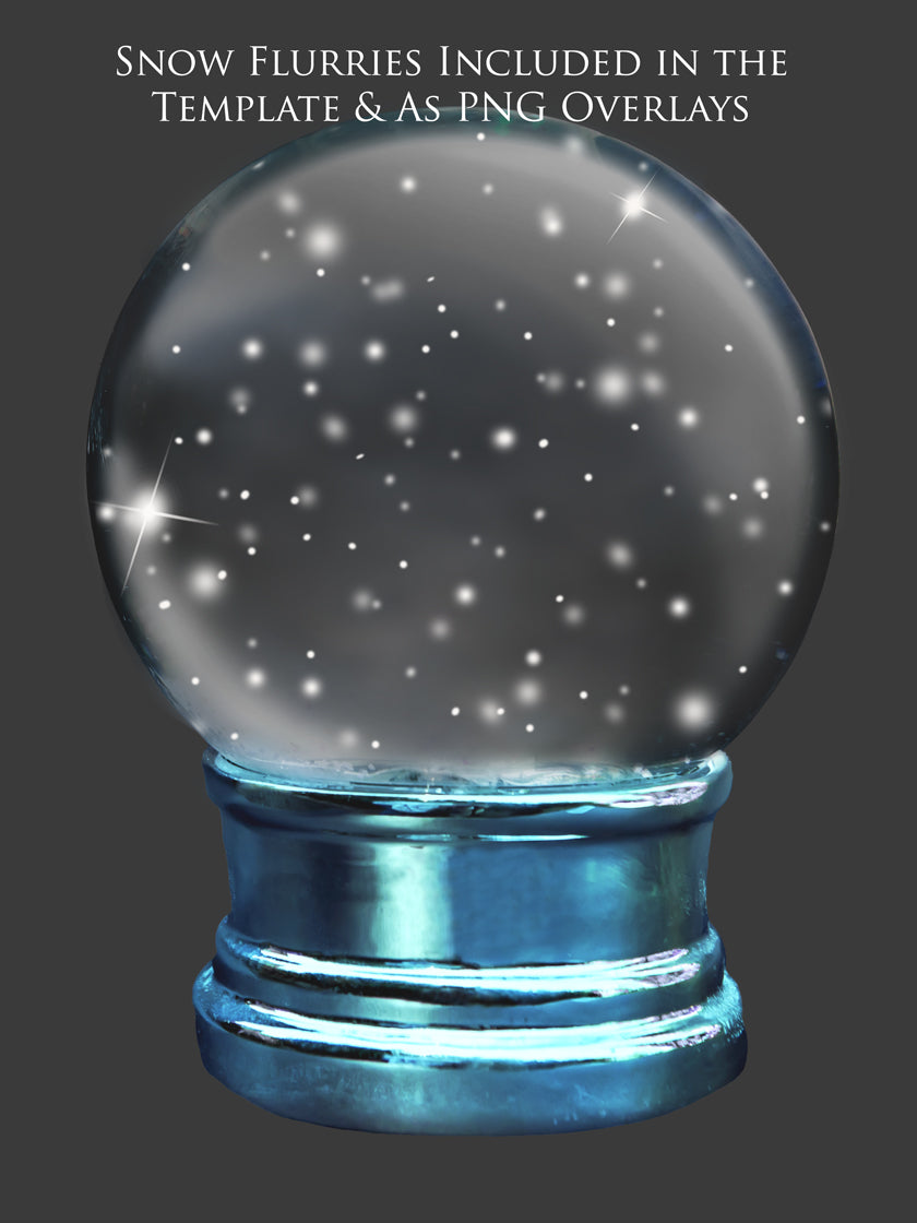 Digital Snow Globe overlays, with snow flurries and a PSD Template included in the set.