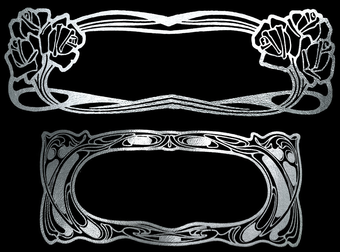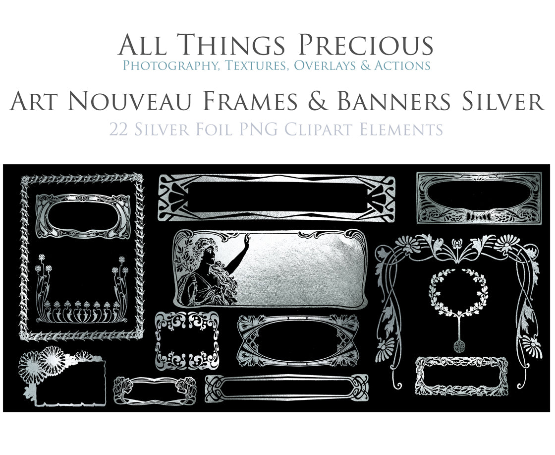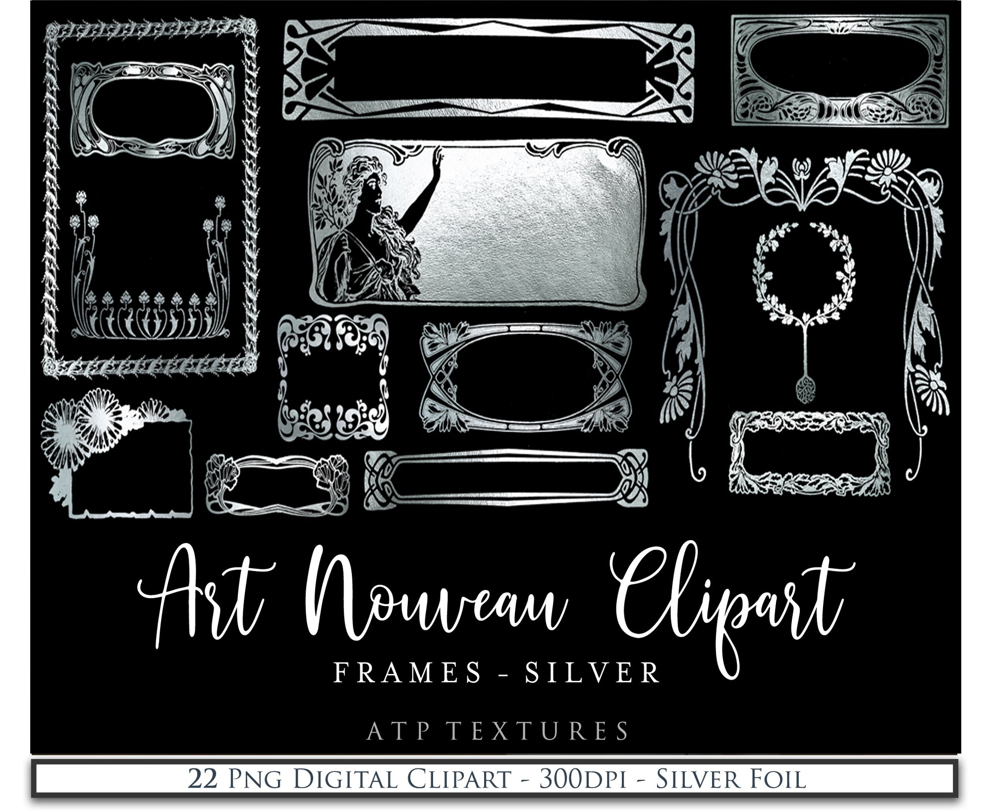 22 High Resolution PNG Art Nouveau Clipart elements, with silver foil overlay.