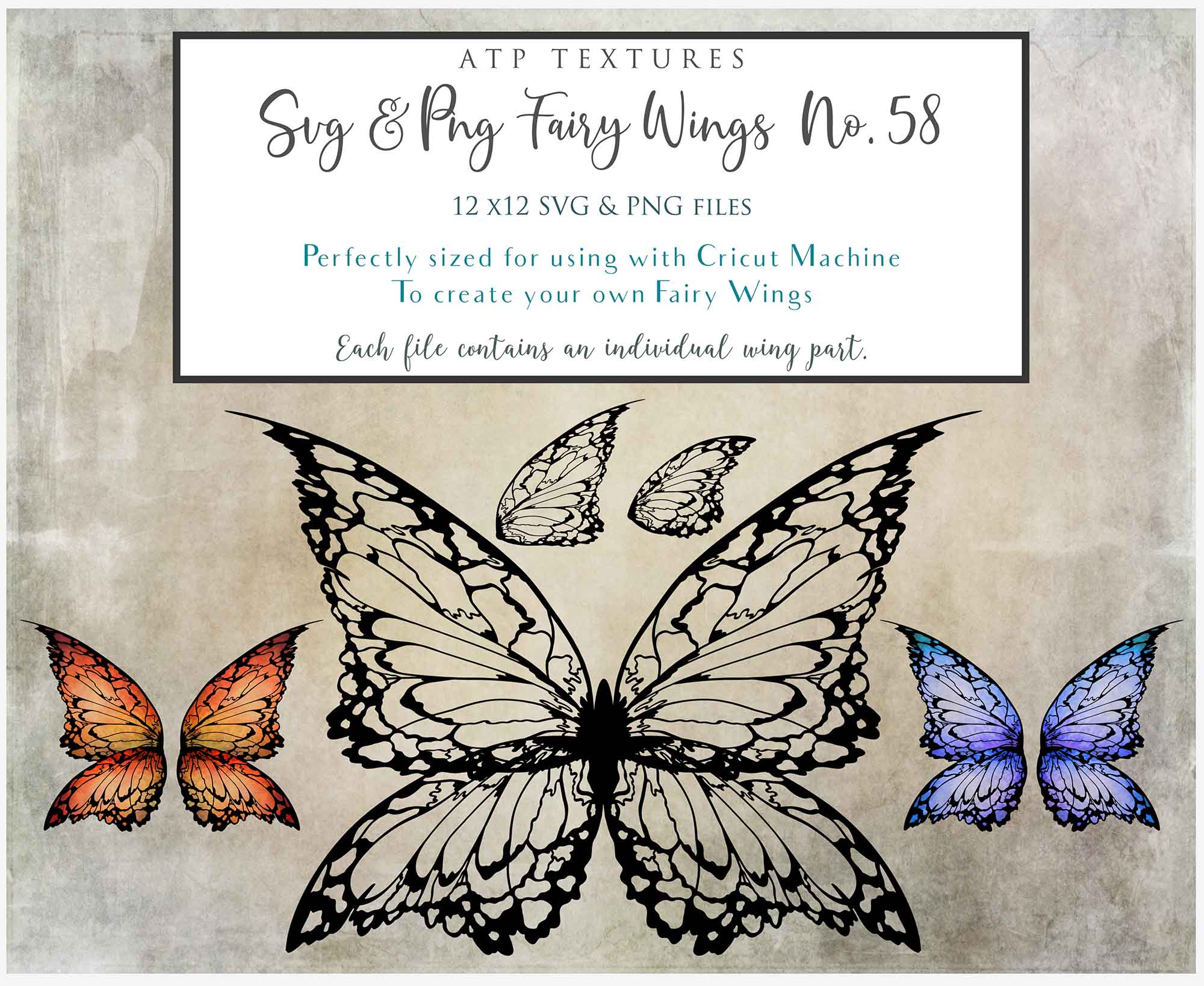 SVG & PNG Fairy/Angel Wing files for Cricut, Silhouette Cameo and other Cutting Machines. Create wearable fairy wings, all sizes. Perfect for Halloween Costumes, Fantasy, Cosplay, Photography. Prints, Wedding, Engagement, Baby Shower invitations, Sublimation Printing, Clip Art and more. Cut and assemble. ATP Textures.