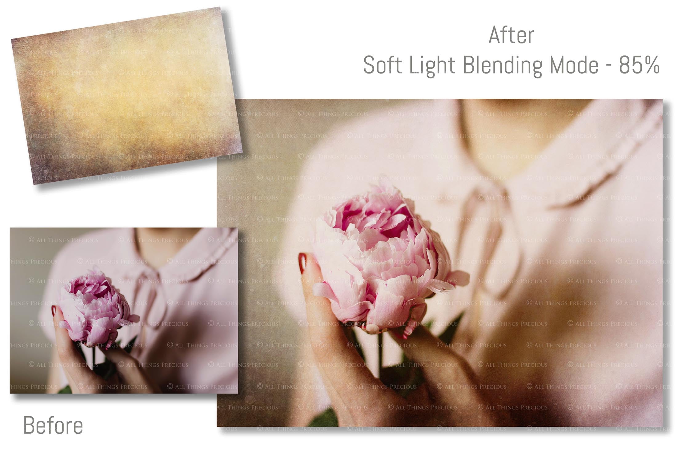 These textures are licensed for one business/photographer/studio only and must not be copied, shared, re packaged for sale or transmitted in any other form, physical or digital, without prior consent from all things precious photography.