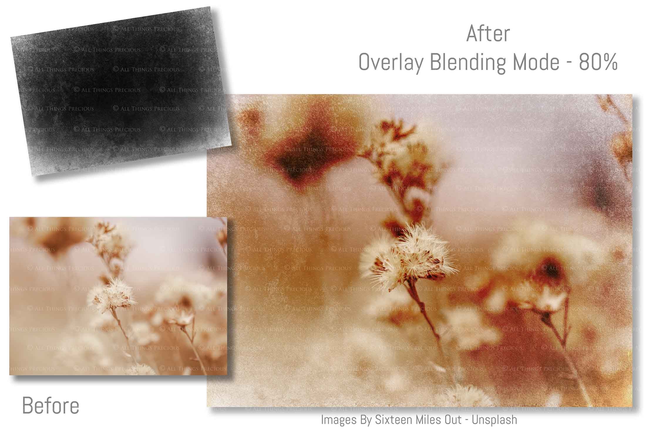 + You can incorporate the textures for sale in your photography as a textured overlay, in a flattened state, without a commercial licence. You will need to add a link to ATP Textures with your listing when selling your work on the internet, eg. Etsy. If you are a professional photographer supplying a finished, printed photograph to clients, you DO NOT have to credit ATP Textures.