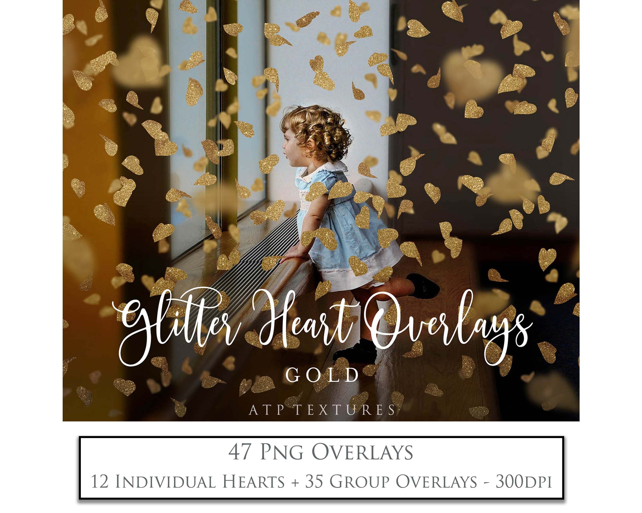 + 37 falling confetti GOLD GLITTER HEART Overlays ( 5000x3300 )