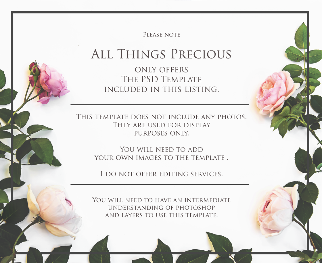These Templates are licensed for one business/photographer/studio only and must not be copied, shared, re sold or transmitted in any other form, physical or digital, without prior consent from all things precious photography.