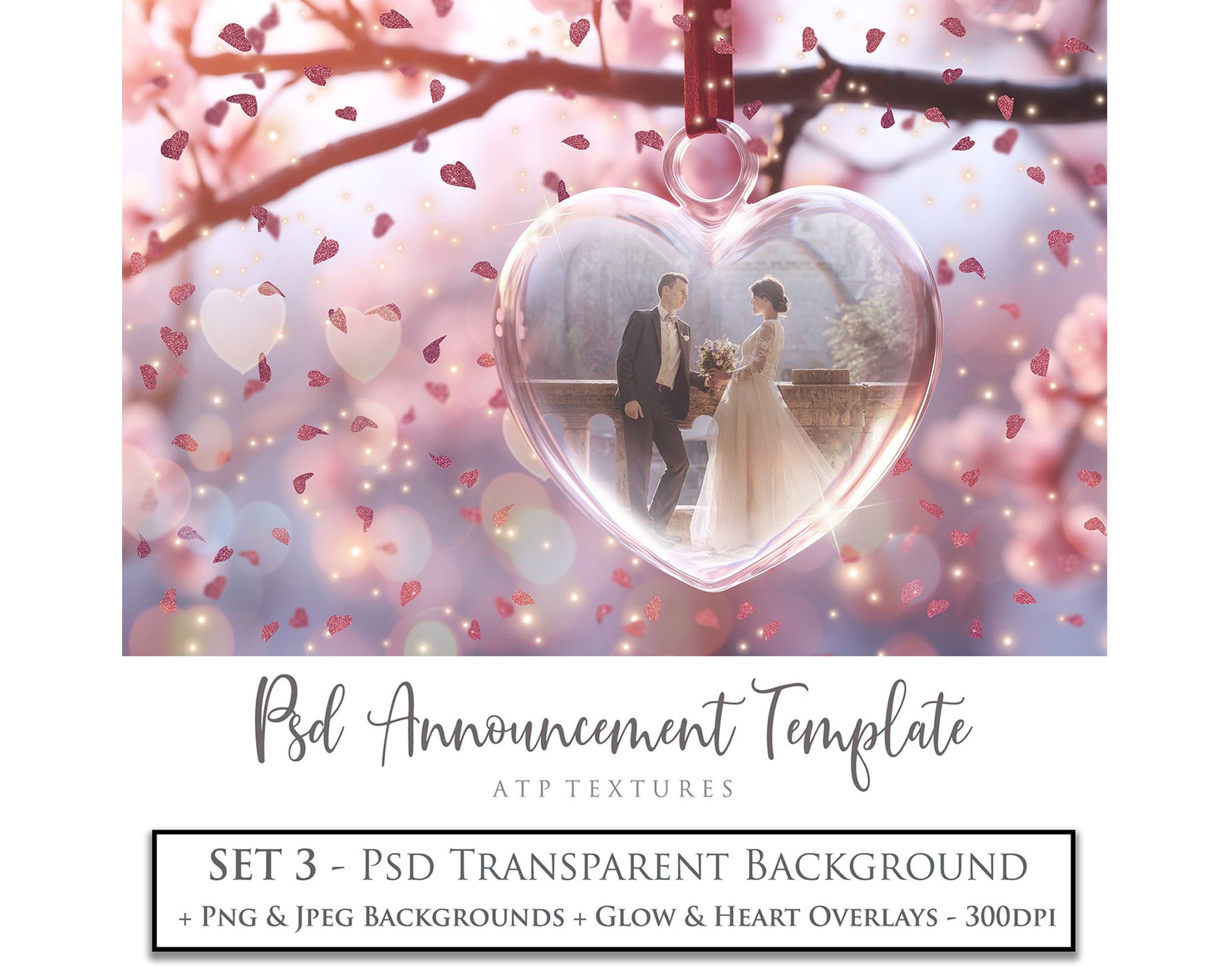 Digital Glass Heart Bauble Background, with snow flurries and a PSD Template included in the set.