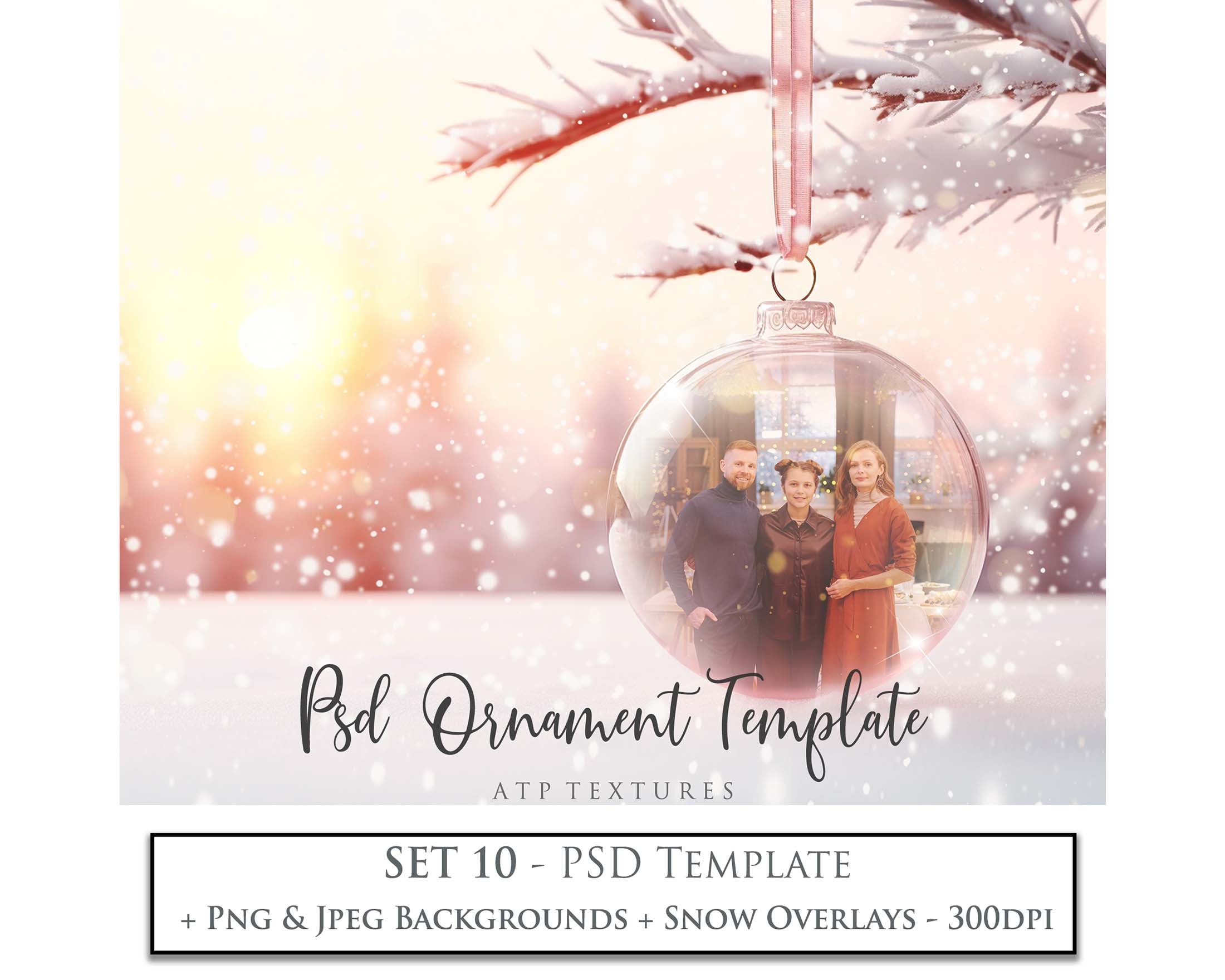 Digital Glass Bauble Background, with snow flurries and a PSD Template included in the set.