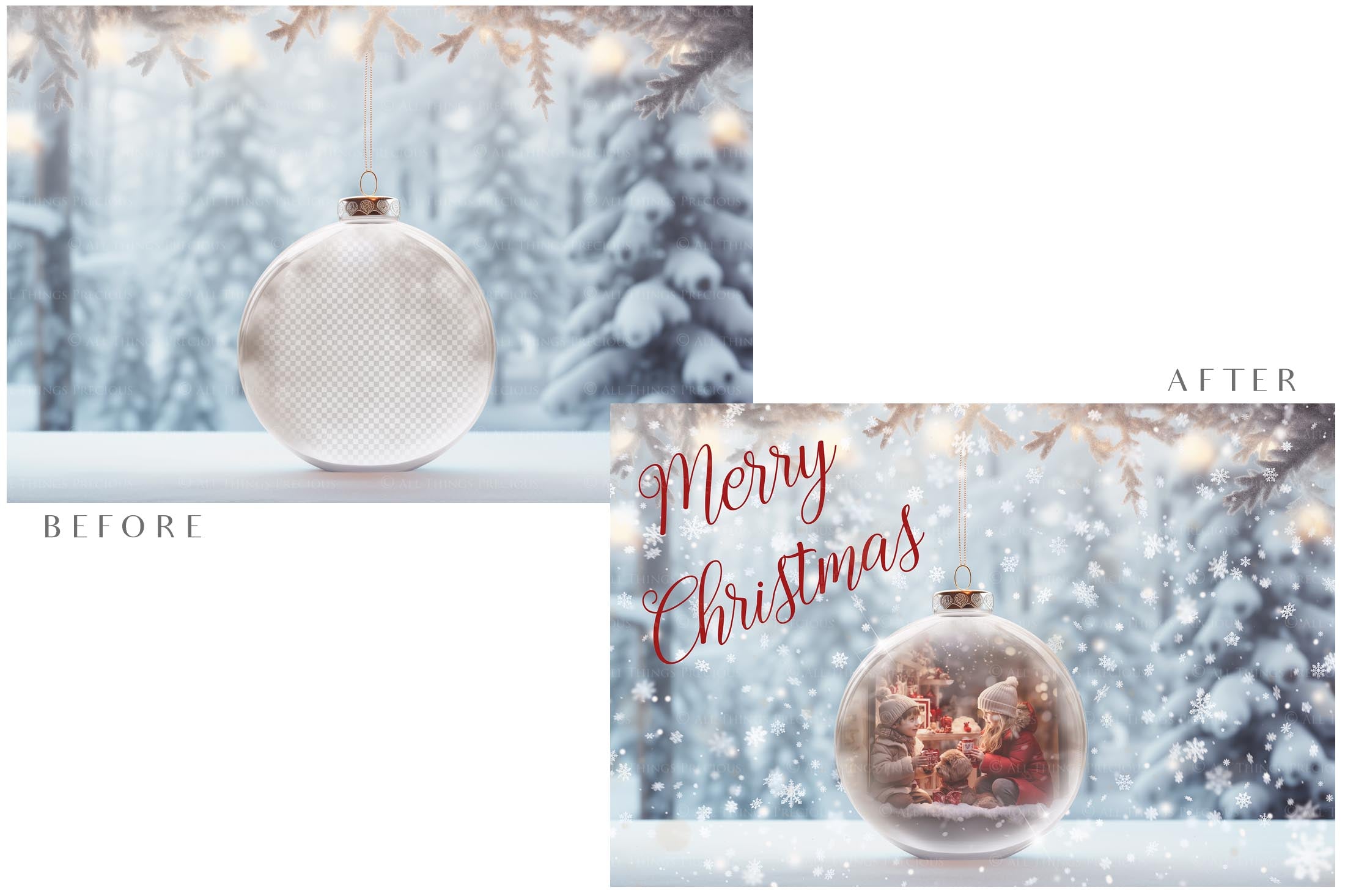 Digital Glass Bauble Background, with snow flurries and a PSD Template included in the set.