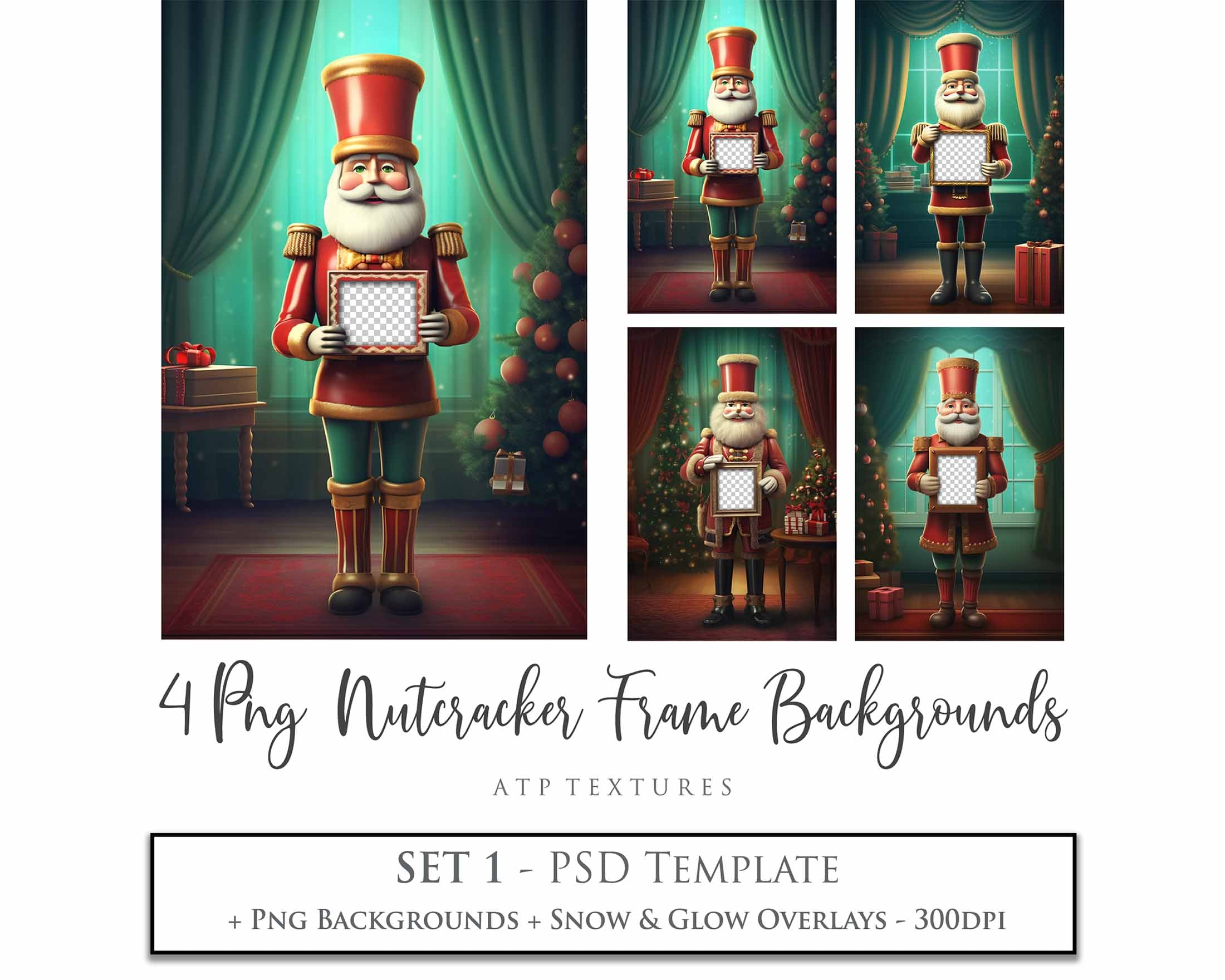 Digital Nutcracker doll with frame background. With snow and glow flurries and a PSD Template included in the set.