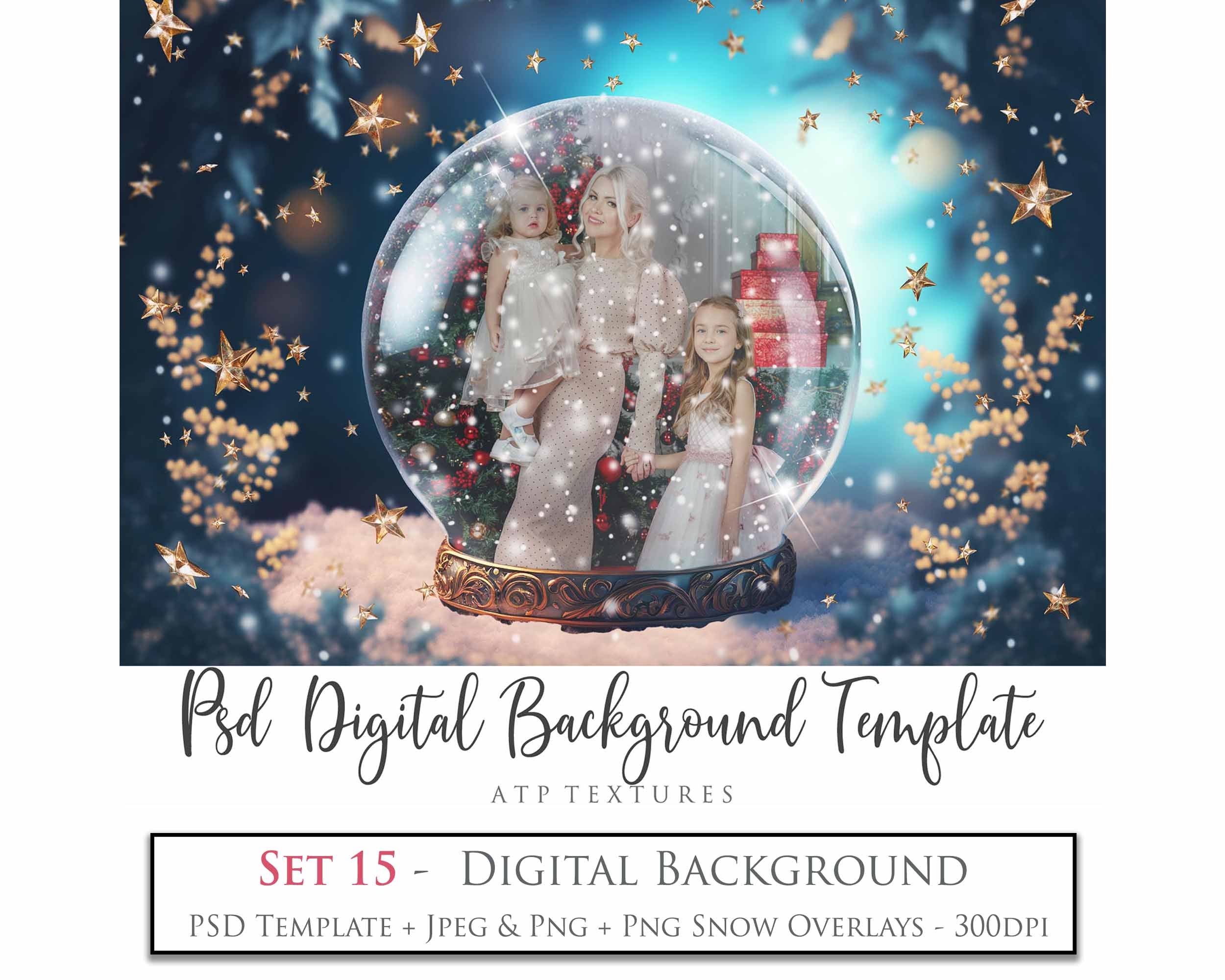Digital Snow Globe Background, with snow flurries and a PSD Template included in the set.