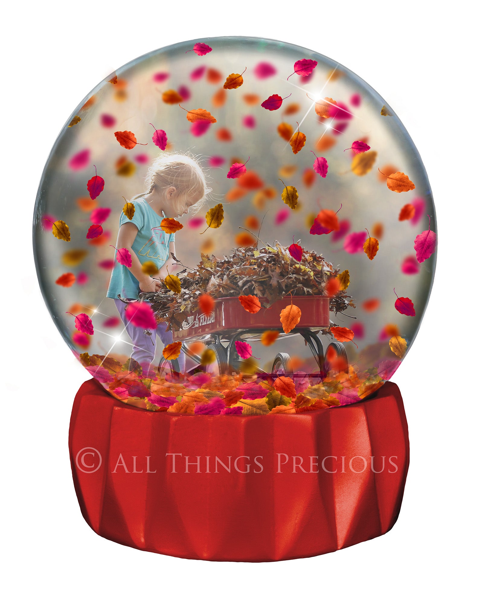 Digital Fall / Autumn Snow Globe overlays, with 6 Falling Leaves Overlays and a PSD Template included in the set.