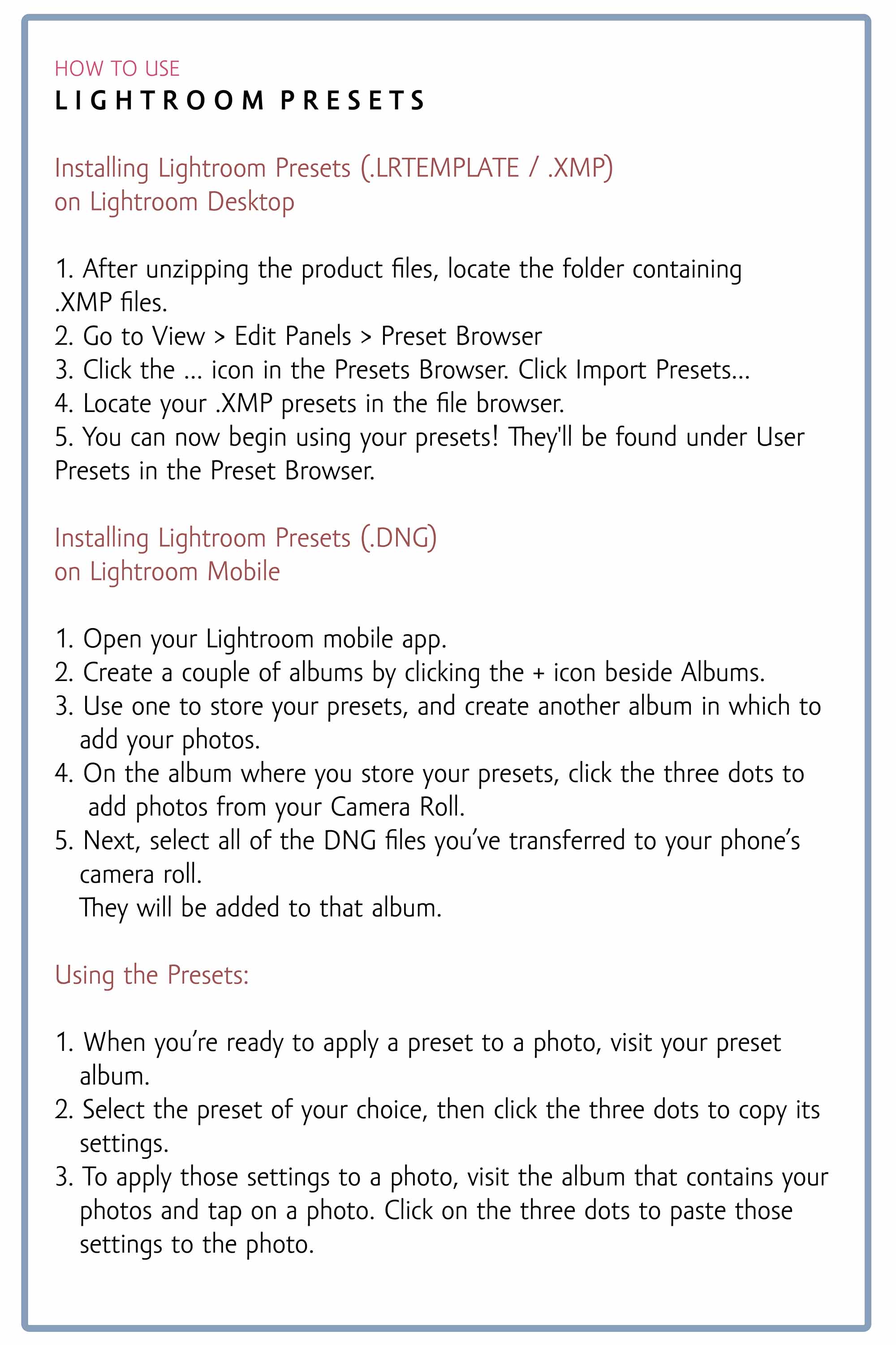 🌸 Instructions for installing lightroom presets into your mobile device and desktop applications.