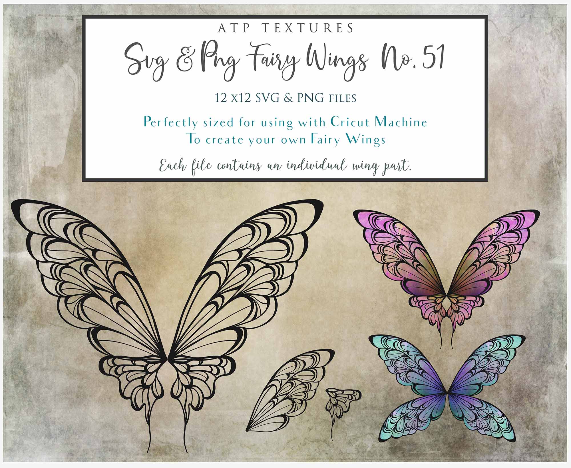 SVG & PNG Fairy/Angel Wing files for Cricut, Silhouette Cameo and other Cutting Machines. Create wearable fairy wings, all sizes. Perfect for Halloween Costumes, Fantasy, Cosplay, Photography. Prints, Wedding, Engagement, Baby Shower invitations, Sublimation Printing, Clip Art and more. Cut and assemble. ATP Textures.