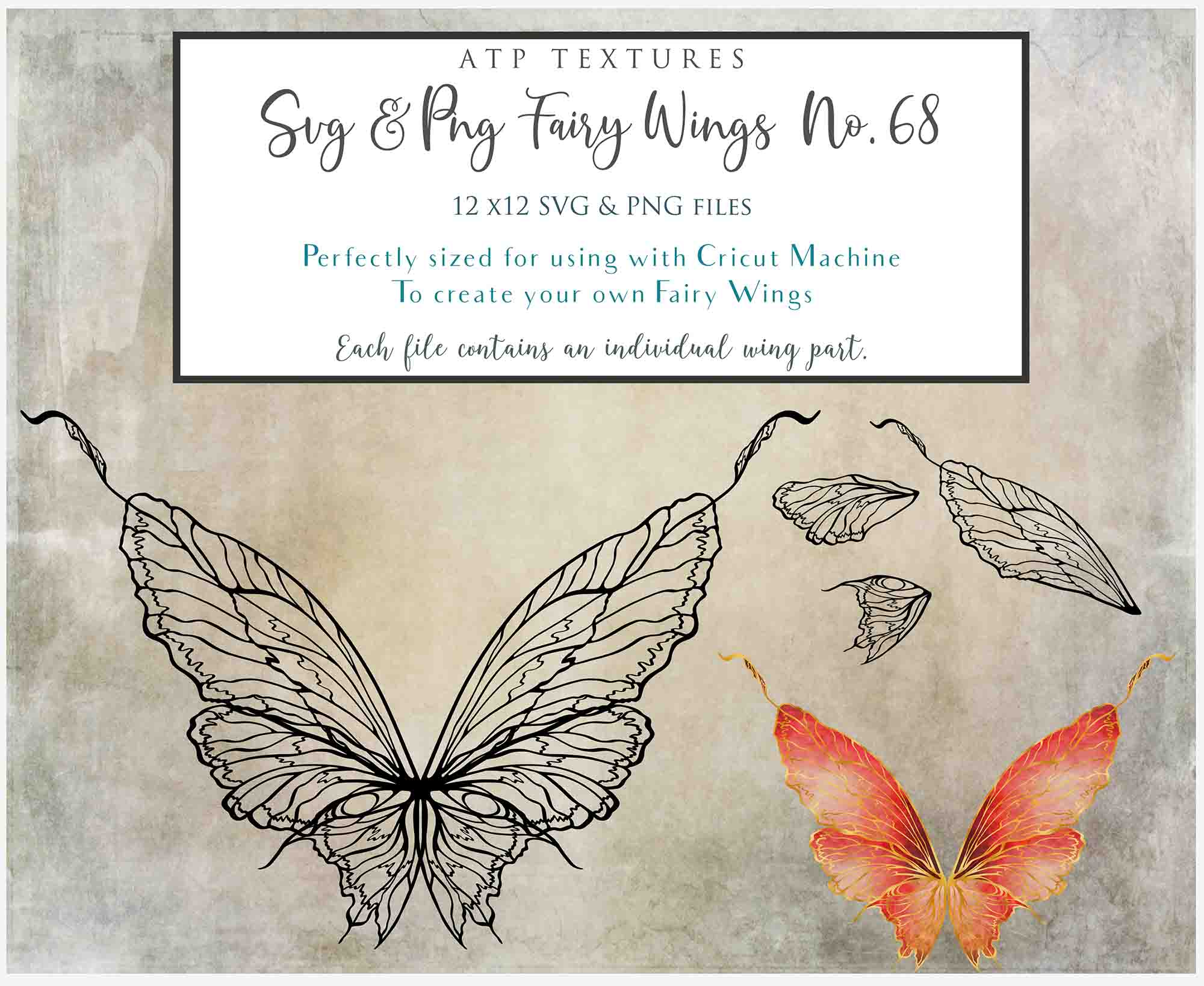 SVG & PNG Fairy/Angel Wing files for Cricut, Silhouette Cameo and other Cutting Machines. Create wearable fairy wings, all sizes. Perfect for Halloween Costumes, Fantasy, Cosplay, Photography. Prints, Wedding, Engagement, Baby Shower invitations, Sublimation Printing, Clip Art and more. Cut and assemble. ATP Textures.