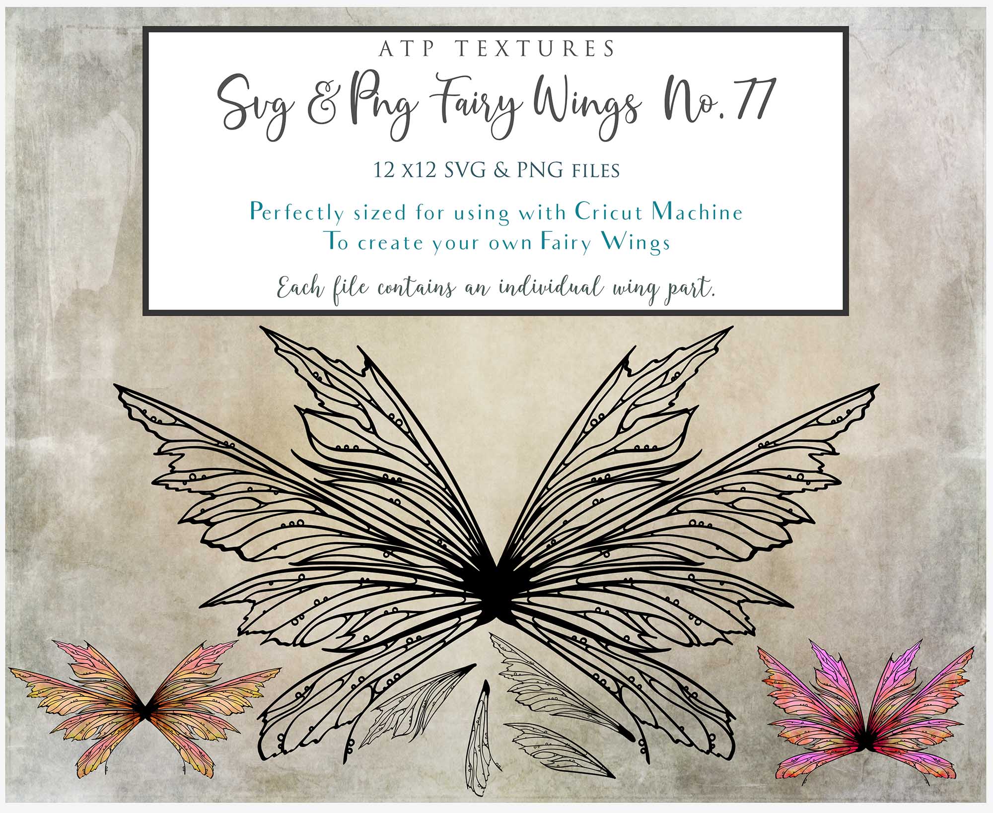 SVG & PNG Fairy/Angel Wing files for Cricut, Silhouette Cameo and other Cutting Machines. Create wearable fairy wings, all sizes. Perfect for Halloween Costumes, Fantasy, Cosplay, Photography. Prints, Wedding, Engagement, Baby Shower invitations, Sublimation Printing, Clip Art and more. Cut and assemble. ATP Textures.