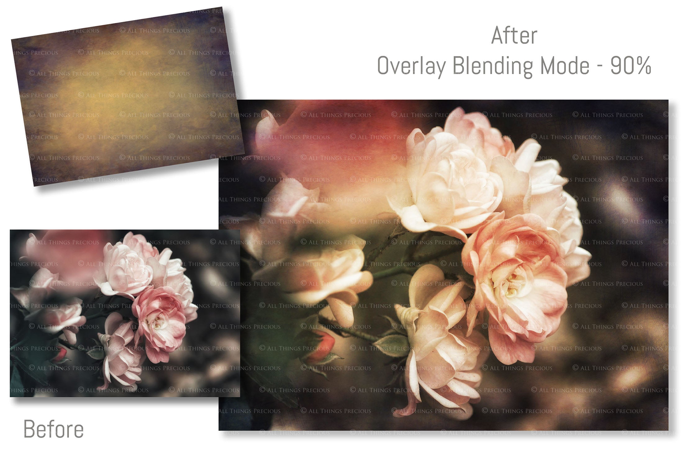 + You can incorporate the textures for sale in your photography as a textured overlay, in a flattened state, without a commercial licence. You will need to add a link to ATP Textures with your listing when selling your work on the internet, eg. Etsy. If you are a professional photographer supplying a finished, printed photograph to clients, you DO NOT have to credit ATP Textures.