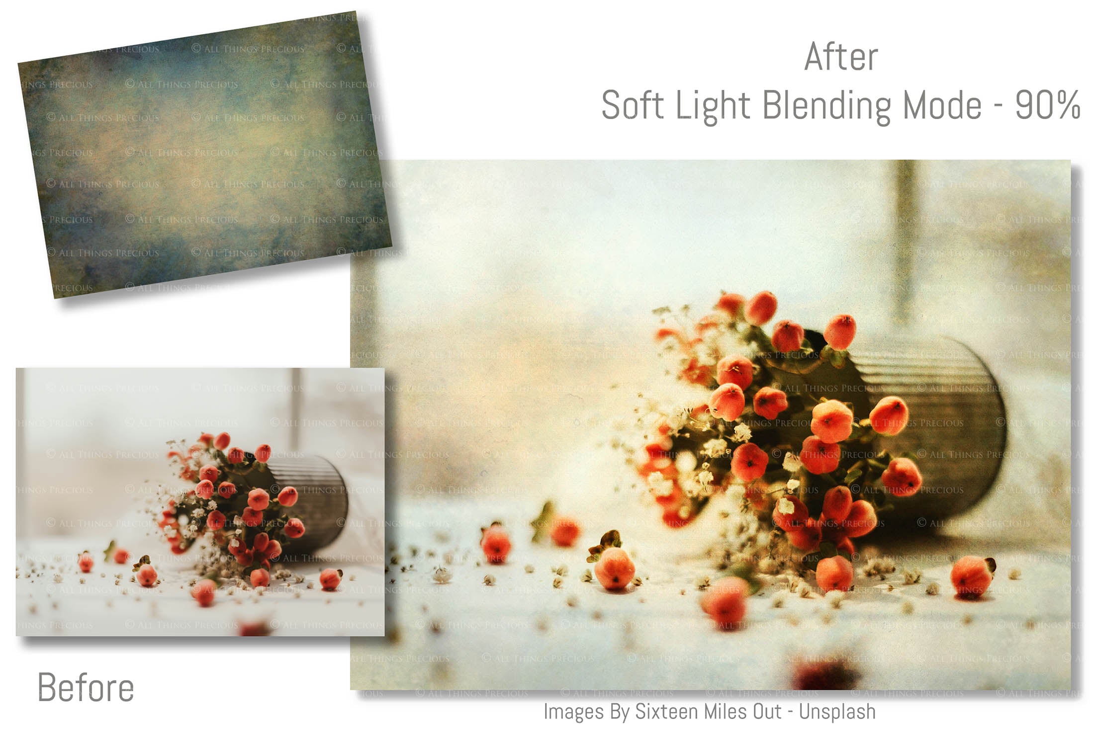 + You can incorporate the textures for sale in your photography as a textured overlay, in a flattened state, without a commercial licence. You will need to add a link to ATP Textures with your listing when selling your work on the internet, eg. Etsy. If you are a professional photographer supplying a finished, printed photograph to clients, you DO NOT have to credit ATP Textures.