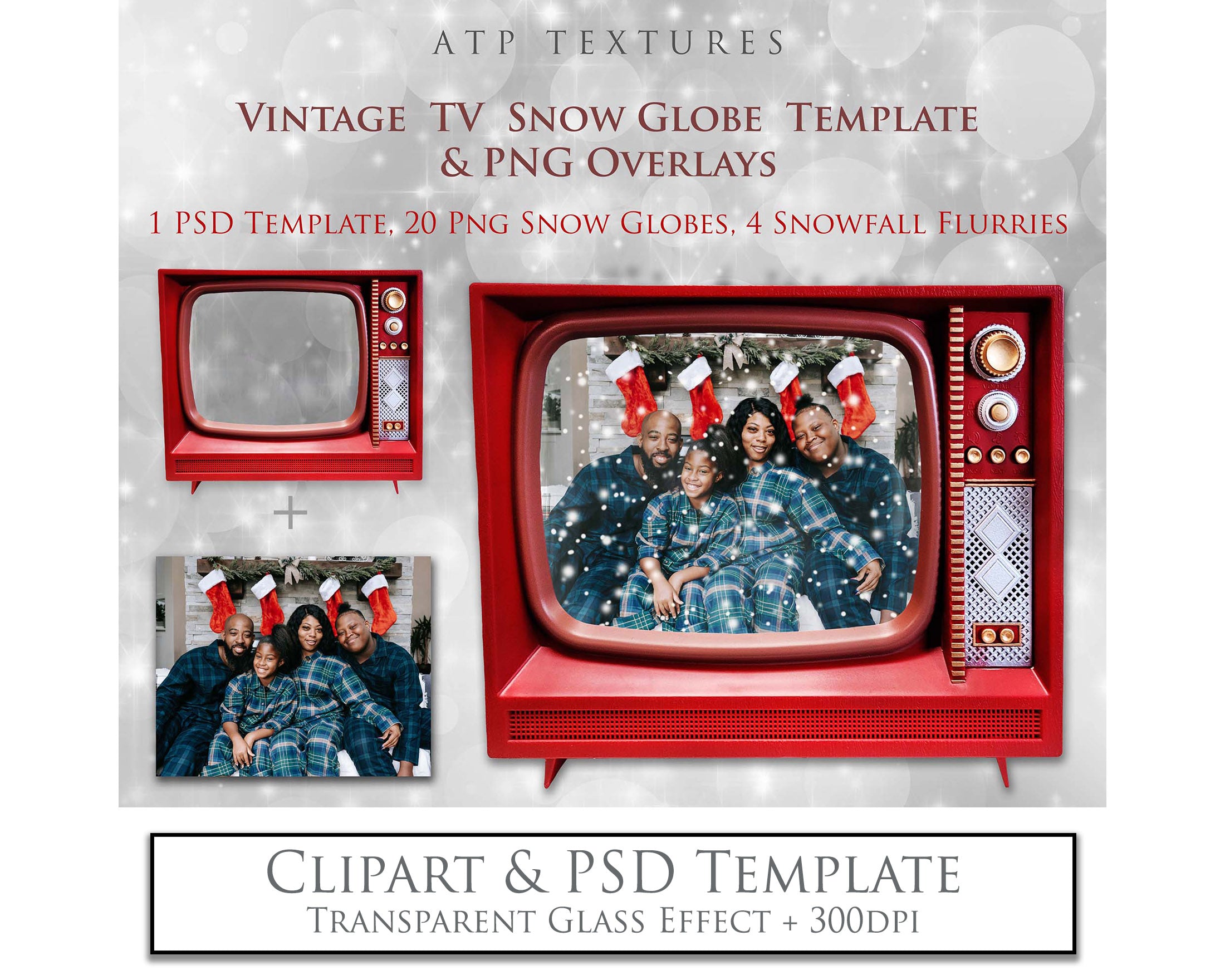 1 PSD File Template which includes the Tv Snow Globe Overlay, colour change layers, Snow flurry Overlays, clipped to the globe, and a clipping mask for you to simply slip in your image.